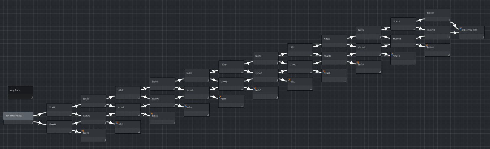 The effect is achieved by arranging sensors in a cone pattern in front of the player. The sensors update a user database depending on whether a wall is detected, and a game object decides which sprites to display based on the database values.